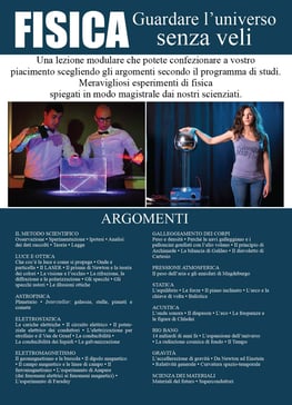 Si parte dal metodo scientifico per giungere a una serie di laboratori interattivi tra cui: la luce e l’ottica, l’elettrostatica e l’elettromagnetismo, il galleggiamento dei corpi, la pressione atmosferica, i gas, la statica, l’acustica, il Big Bang, il tempo, la gravità, l’astrofisica, i materiali del futuro, la scienza dei materiali. Un ricco repertorio di fisica, zeppo di esperimenti e dimostrazioni. A vostra scelta.