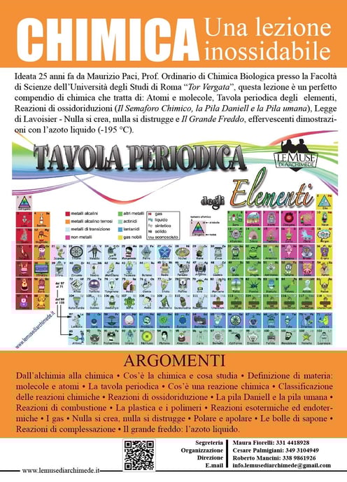 Ideata 25 anni fa da Maurizio Paci, Prof. Ordinario di Chimica Biologica presso la Facoltà di Scienze dell’Università degli Studi di Roma “Tor Vergata”, questa lezione è un perfetto compendio di chimica che tratta di: Atomi e molecole, Tavola periodica degli elementi, Reazioni di ossidoriduzioni (Il Semaforo Chimico, la Pila di Daniell e la Pila umana), Legge di Lavoisier (Nulla si crea, nulla si distrugge) e Grande Freddo, effervescenti dimostrazioni con l’azoto chimico (-195 °C).
