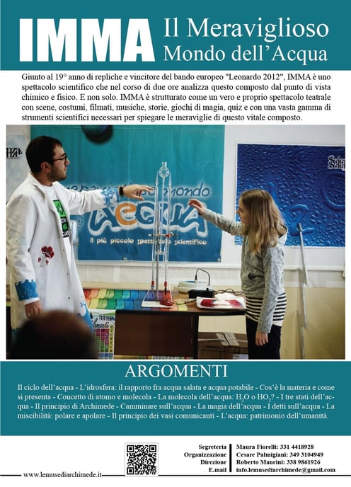 Giunto al 12° anno di repliche e vincitore del bando europeo Leonardo 2012, IMMA è uno spettacolo scientifico che nel corso di due ore analizza questo composto dal punto di vista chimico e fisico. E non solo. IMMA è strutturato come un vero e proprio spettacolo teatrale con scene, costumi, filmati, musiche, storie, giochi di magia, quiz e soprattutto una vasta gamma di strumenti scientifici necessari per spiegare le meraviglie di questo vitale composto.